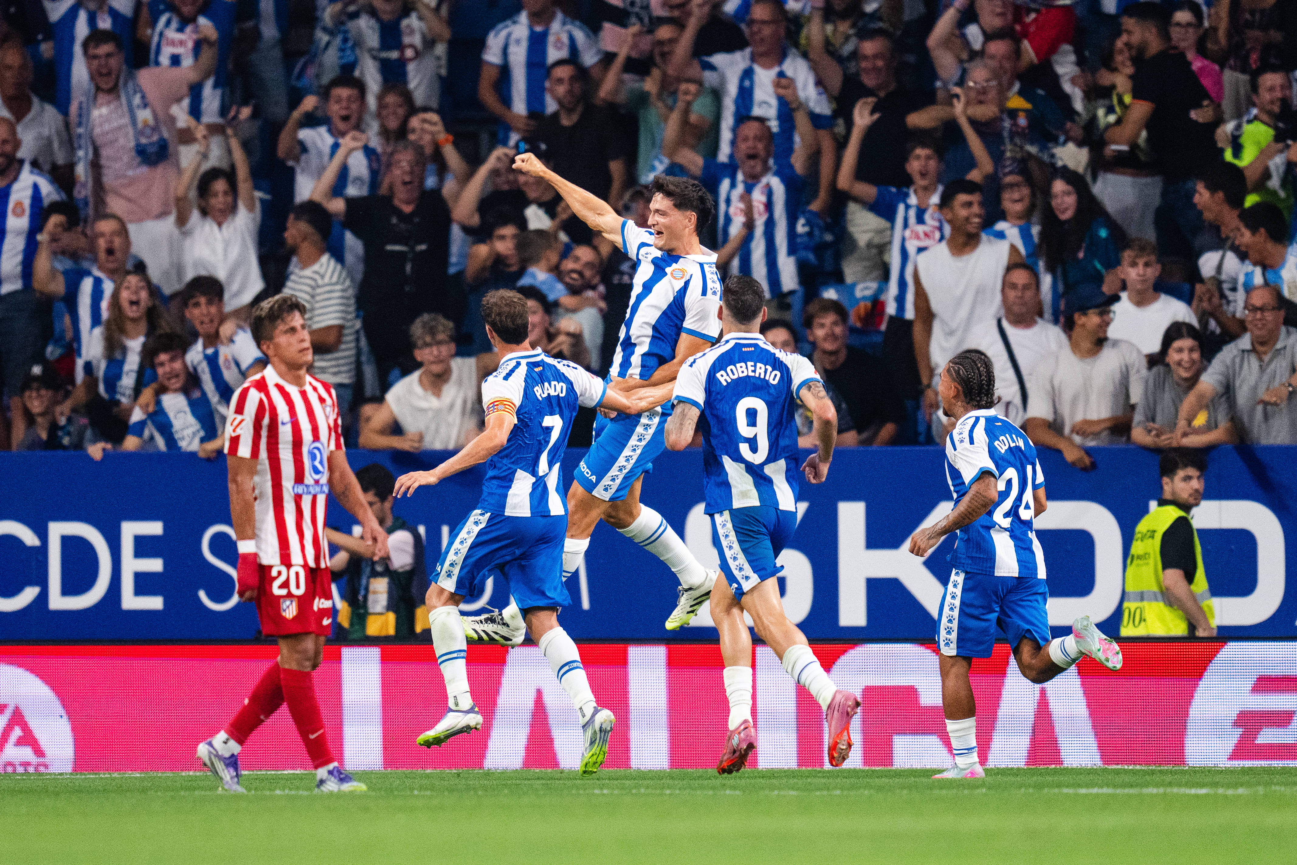 新华社马德里8月17日电(谢宇智)2025-2026赛季西班牙足球甲级联赛首轮17日继续进行。马德里竞技首战失利,客场1:2遭西班牙人逆转。 上半时第37分钟,客队获得前场任意球,阿尔瓦雷斯罚出的皮球直挂球门左角,帮助马竞1:0领先对手。下半场,马竞在第57分钟错过扩大比分的机会,阿尔瓦雷斯的一脚射门击中门柱弹出。 8月17日,马德里竞技球员阿尔瓦雷斯在比赛中庆祝进球。新华社发(胡安·戈萨 摄) 落后的西班牙人随后吹响反攻号角。第73分钟,埃克斯波西托开出任意球,米格尔·卢比奥右门柱附近将皮球近距离垫入网窝。第84分钟,埃尔希拉利右路传中,米利亚头球破门,帮助西班牙人将比分反超,并最终取胜。 8月17日,西班牙人球员在比赛中庆祝进球。新华社发(胡安·戈萨 摄) 当日其他两场比赛中,毕尔巴鄂竞技3:2击败塞维利亚,赫塔菲2:0战胜塞尔塔。